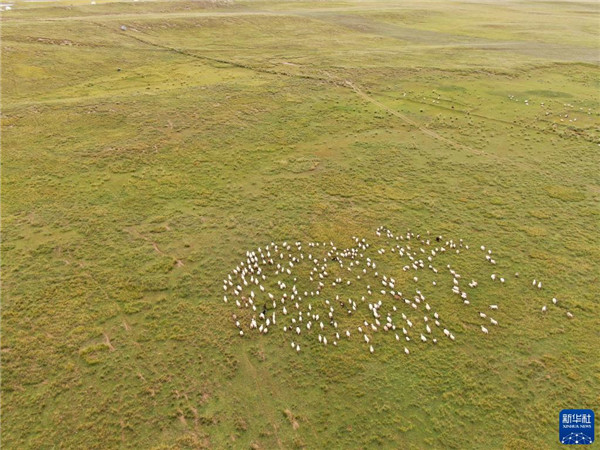 9月15日,一群羊在青海湖岸邊的牧場上覓食(無人機照片)。