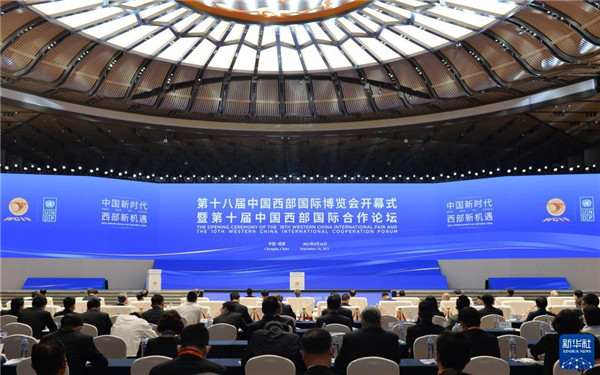 這是9月16日拍攝的第十八屆中國(guó)西部國(guó)際博覽會(huì)開幕式現(xiàn)場(chǎng)。