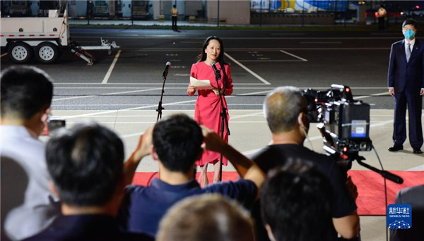 9月25日晚,在黨和人民親切關(guān)懷和堅(jiān)定支持下,孟晚舟在結(jié)束被加拿大方面近3年的非法拘押后,乘坐中國(guó)政府包機(jī)抵達(dá)深圳寶安國(guó)際機(jī)場(chǎng),順利回到祖國(guó)。這是孟晚舟致辭。新華社記者 鄧華 攝