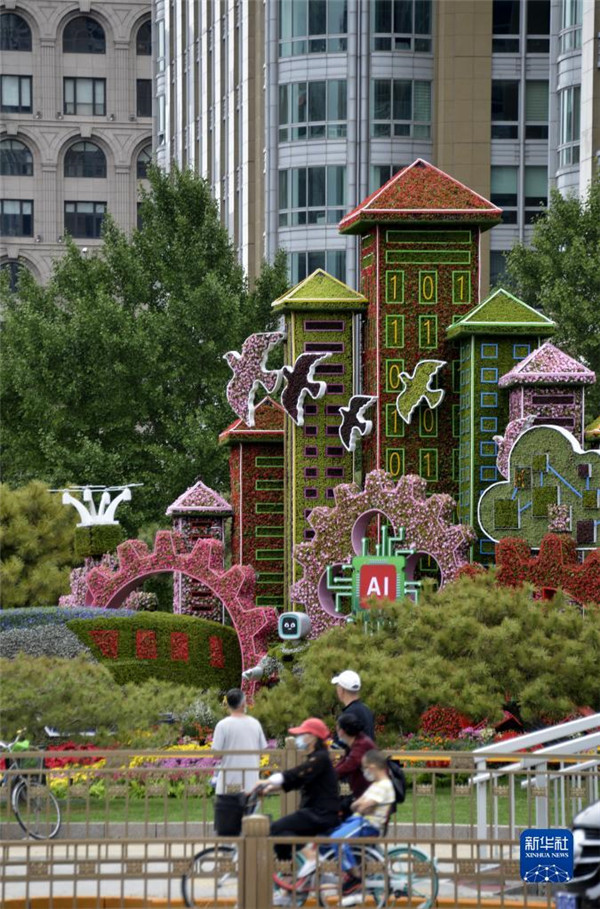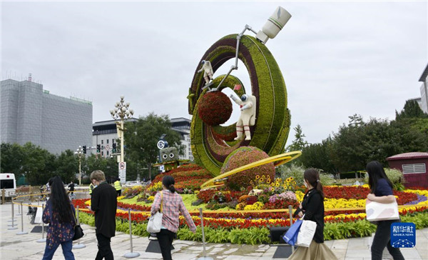 9月25日,市民從北京長安街東單路口的主題花壇前經過。