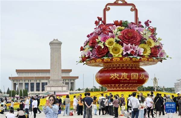 當日,為迎接國慶節到來,北京天安門廣場18米高的“祝福祖國”巨型花籃以及長安街沿線的10處各具特色的主題花壇正式亮相。天安門廣場中心的“祝福祖國”主題花壇,以喜慶的花果籃為主景,花籃內有太平花、榆葉梅、郁金香、百合花等40多種仿真花卉和水果,長安街沿線布置的10處主題花壇集中展示祖國各項發展的歷史性成就。