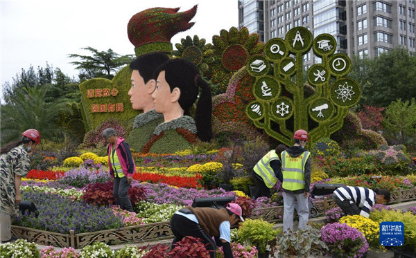 9月25日,園林工人對北京長安街東單路口的主題花壇進行最后修飾。