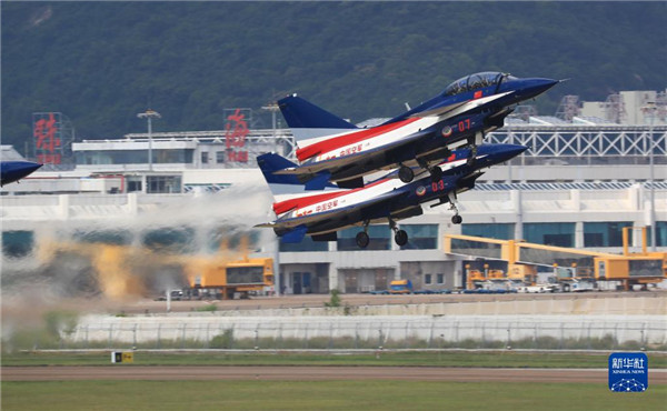 9月28日,中國空軍八一飛行表演隊在第十三屆中國國際航空航天博覽會開幕式上進行飛行表演。
