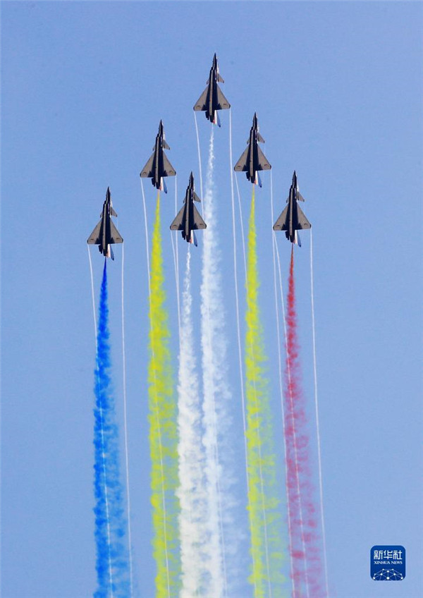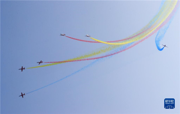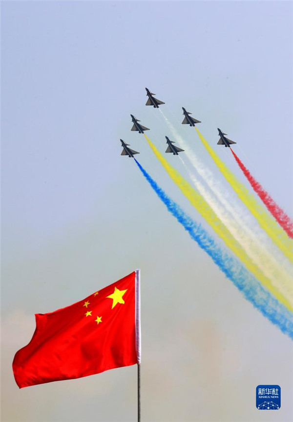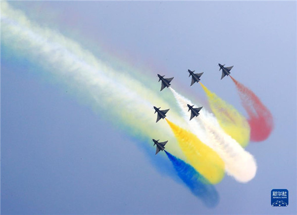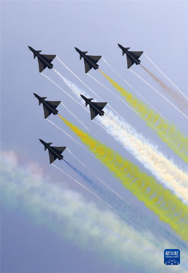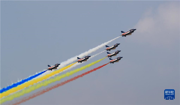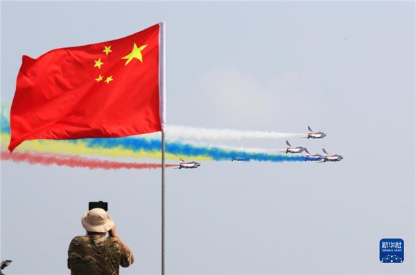 9月28日,中國空軍八一飛行表演隊在第十三屆中國國際航空航天博覽會開幕式上進行飛行表演。
