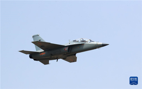 9月28日,中國空軍教-10飛機在第十三屆中國國際航空航天博覽會開幕式上進行飛行表演。