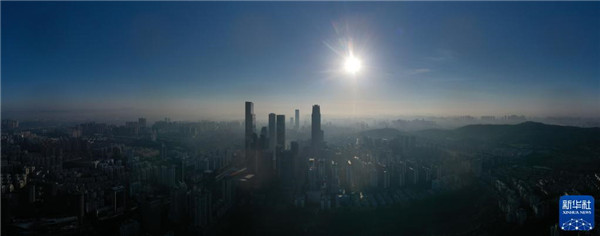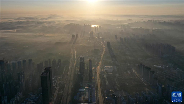 朝陽映射下的南寧市區(無人機照片,9月28日攝)。