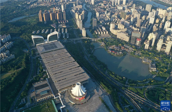 朝陽映射下的南寧國際會展中心和民歌湖(無人機照片,9月28日攝)。