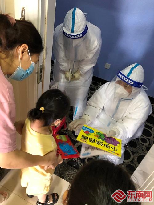 除了日常的核酸采集工作,醫護人員想方設法為隔離人員提供關懷。鑒于隔離點上孩子多,隔離酒店生活比較枯燥單調,孩子們除了看電視,沒有其它的娛樂活動,成年人待著尚覺著無聊煩悶,更何況低齡兒童呢?隔離點安排采購兒童畫冊、玩具等,讓孩子在隔離期間可以解解悶,健健康康地度過隔離期。“在孩子進來第一次采集核酸的時候,很多小孩子感到害怕不肯配合,我們就安慰他們說這次好好配合,下回給你們買玩具。在孩子們收到愛心人士送來的禮物后都非常開心,也很配合核酸采集工作。”護士喻茜說道。