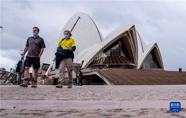 10月11日,戴口罩的行人從澳大利亞悉尼歌劇院前走過。