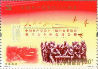 郵票作為“國家名片”,在方寸之間展示著一個國家、一個時代的形象、風貌和精神。近年發(fā)行的《改革開放四十周年》《中國共產黨成立100周年》《扶貧日》紀念郵票,從不同的側面串聯起了一張山鄉(xiāng)巨變的畫卷:一間破舊茅草屋內,18戶村民聚在一起,他們有的眉頭緊鎖,有的沉著冷靜,在一張事先擬好的契約上按下紅手印——這是“改革春潮”主題郵票中展現的安徽省鳳陽縣小崗村大包干紀念雕塑。40多年前,小崗村人憑著“敢為天下先”的勇氣,拉開了我國農村改革的序幕。