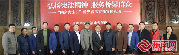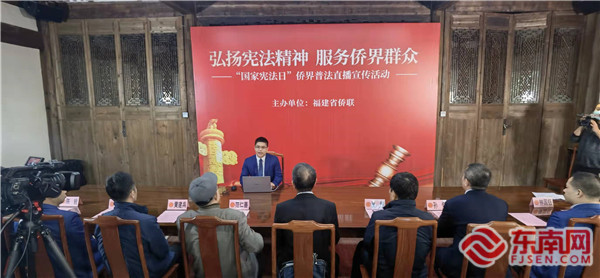 東南網12月4日訊(本網記者 王文青)12月3日下午,由福建省僑聯主辦的“國家憲法日”僑界普法直播宣傳活動在福州成功舉辦。福建省僑聯黨組成員、副主席翁小杰,省僑聯顧問律師、北京市盈科(福州)律師事務所高級合伙人鐘彬,福州市、鼓樓區僑聯和法顧委成員以及歸僑僑眷代表等近30人在線下出席活動,線上邀請海外閩籍社團參加。