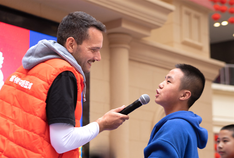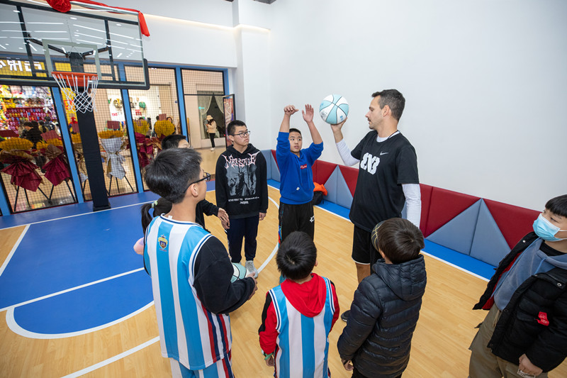 1月1日,塞鐵雙語籃球館中國首店在福建省福州開業。圖為塞爾維亞籍籃球教練ALEX.T與學員互動 陳佳立供圖