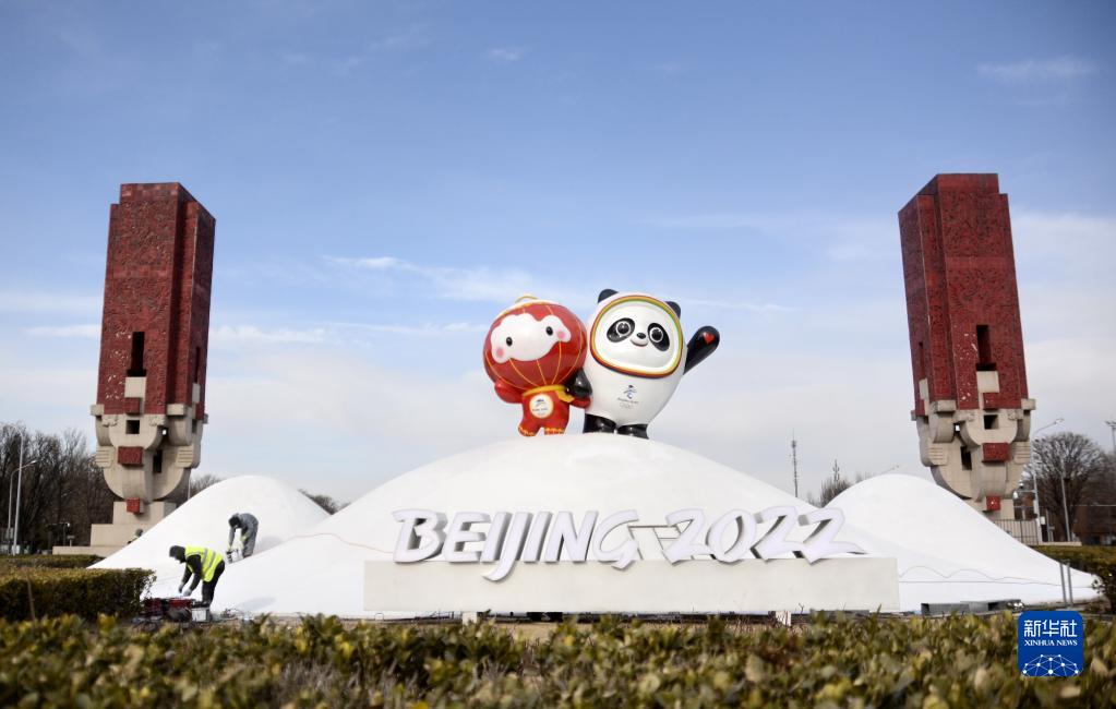 約7.5米高的北京2022年冬奧會和冬殘奧會吉祥物“冰墩墩”“雪容融”日前在位于北京中軸線的奧林匹克景觀大道南端亮相。“冰墩墩”和“雪容融”可愛的造型吸引了路人的目光。